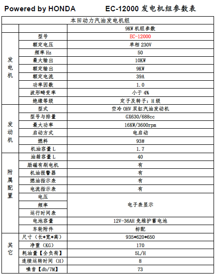 本田汽油發電機 EC12000 9KW單相+電啟動