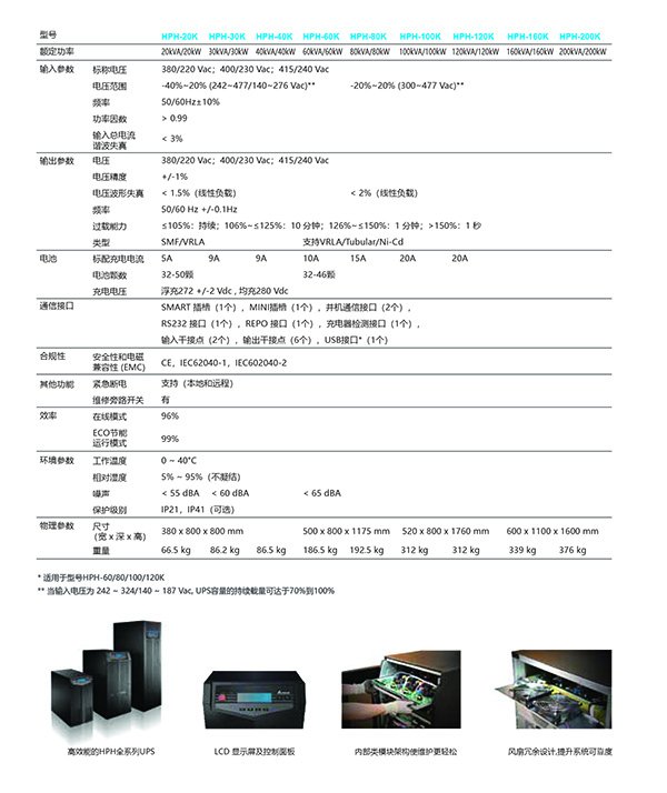 Ultron HPH是一款純在線式雙變換UPS,提供最大可用功率,無與倫比的整機效率,以及優越的整機性能,為中小型數據中心和其它關鍵業務應用提供高可靠的供電保護。Ultron HPH采用全額定功率輸出設計,帶任意功率因數負載,均無需降容使用(KVA=KW)。得益于功率因子校正(PFC)與逆變器的三電平IGBT拓樸架構,Ultron HPH整機效率可高達96%,ECO模式效率也高達99%.臺達先進的數字PFC控制技術并實現了輸入總諧波失真小于3%,輸入功率因子大于0.99,有效降低總體擁有成本。通過失效保護設計機制,顯著提高系統可用性,Ultron HPH是您關鍵基礎設施最理想的供電解決方案。