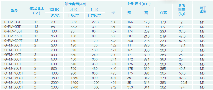 在20℃環境下,FM系列小型密封電池浮充壽命可達3~5年,FM固定型密封電池浮充壽命可達8~10年,FML系列電池浮充壽命可達10年,FMH系列電池浮充壽命可達10年,GFM系列、太陽能深循環系列電池浮充壽命可達15年,GFMJ系列電池浮充壽命可達18年。