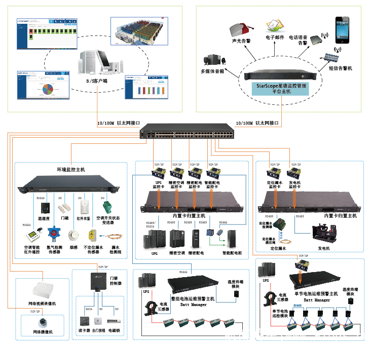 Kstar StarScope瞻機房動力環(huán)境集中監(jiān)控管理系統(tǒng),主要對數(shù)據(jù)中心機房及其他動力環(huán)境的動力設備、環(huán)境及現(xiàn)場圖像實行監(jiān)控,包含集中監(jiān)控上層軟件,采集硬件以及傳感配套產(chǎn)品,通過遠程傳輸,對數(shù)據(jù)中心機房等相關站點的UPS、蓄電池、高低壓配電、油機、精密空調(diào)等多種設備以及溫度、濕度、火警、盜警等環(huán)境參量以及現(xiàn)場圖像集中進行實時檢測,能夠及時判斷故障并產(chǎn)生告警,對遠端設備進行遙控和調(diào)節(jié),從而實現(xiàn)機房服務器,網(wǎng)絡設備、通信設備提供穩(wěn)定、安全的運行環(huán)境。采用這種現(xiàn)代化的監(jiān)控系統(tǒng),其根本目的是為了提高設備的維護和管理質(zhì)量,降低設備維護成本,提高整體工作效率,從而建立起一套高可靠性、高效率的維護體制。適用于金融、政 府、電信行業(yè)、企業(yè)等大型、中小型數(shù)據(jù)中心。