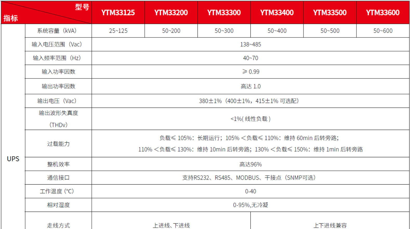 YTM33 系列 (50~600kVA) 鋰電 UPS 系統,主機采用先進的三電平逆變技術,由 UPS 機柜、功率模塊、旁路模塊、系統控制模塊組成,結合磷酸鐵鋰電池能量密度高、占地面積小、使用壽命長、安全性能高、運維方式便捷等特點,整個系統采用模塊化設計,占地面積小、易于擴展、可按需擴容,適用于政府、教育、金融、通信、保險、交通、稅務、證券、能源等行業的數據中心、網絡計算機房。