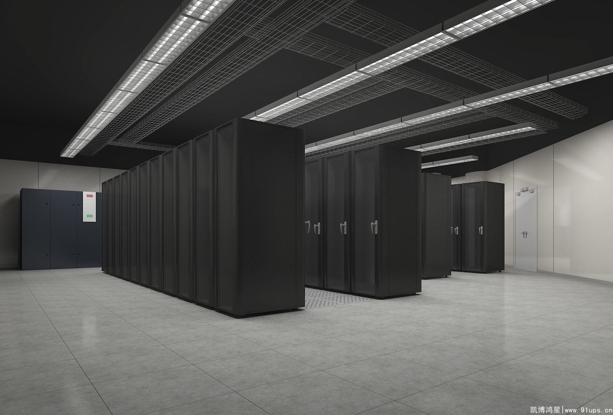 中心機房地面鋪有防靜電地板,墻面為鋁扣板,窗戶為斷橋鋁門窗,頂面為鋁扣板吊頂。